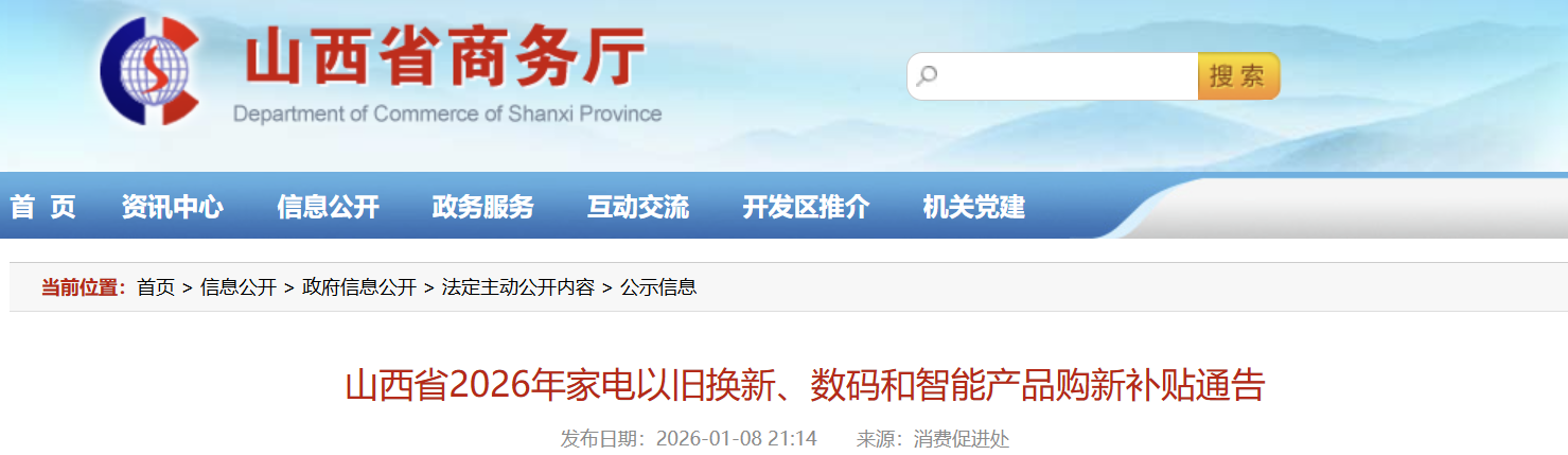 1月8日,山西省商务厅发布《山西省2026年家电以旧换新、数码和智能产品购新补贴通告》,明确为贯彻落实国家发改委、财政部及商务部等部门相关文件要求,该补贴活动定于2026年1月9日10:00开始,在山西省内购买补贴产品并完成收货的个人消费者,收货地址需在山西省内即可参与,2025年已享受补贴的个人消费者,2026年购买同类产品可继续享受补贴。