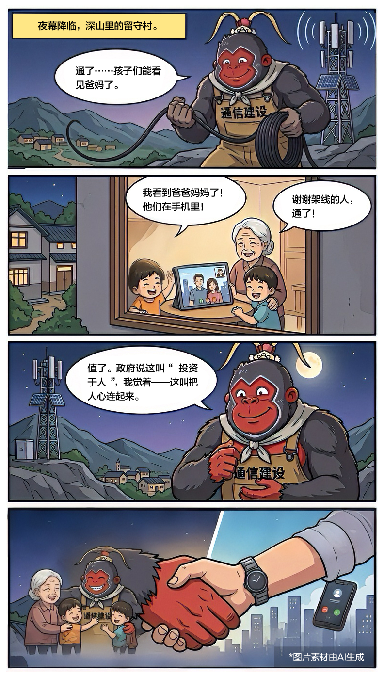 猩猩怪不再从山脚往山顶搬砖了。他加入了通信建设队,在深山里架5G基站。光缆接通那天,山下的留守村亮起了视频通话的窗口,孩子隔着屏幕喊“爸爸”。