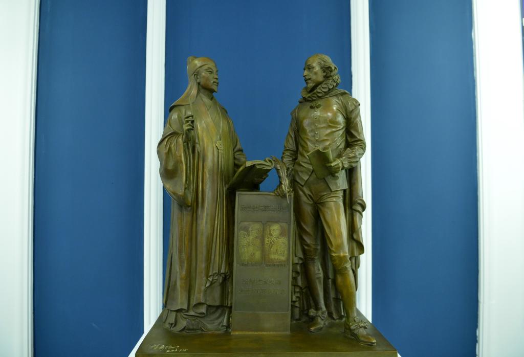这是中国江西抚州汤显祖纪念馆陈列的汤显祖遇见莎士比亚铜像(2016年10月12日摄)。新华社记者 周密 摄