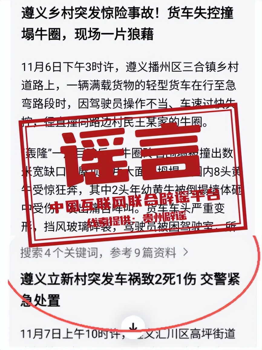 真相:近日,有网民在网络平台发布“贵州遵义汇川区高坪镇发生一起交通事故,导致两死一伤”“贵州遵义播州区三合镇货车失控撞向牛圈”信息,引发关注。经核实,上述信息均为谣言,系网民杨某为博取关注,利用AI工具刻意虚构内容。目前,公安机关已依法对其处以行政罚款的处罚。(来源:“贵州辟谣”微信公众号、“汇川公安”微信公众号)