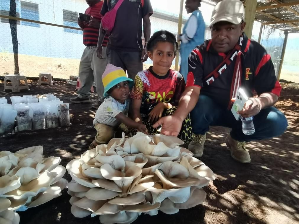9月29日,在巴布亚新几内亚东高地省首府戈罗卡市,当地民众参观中国援巴布亚新几内亚菌草旱稻项目永久性示范基地种植的大平菇。新华社发(福建农林大学国家菌草工程技术研究中心供图)