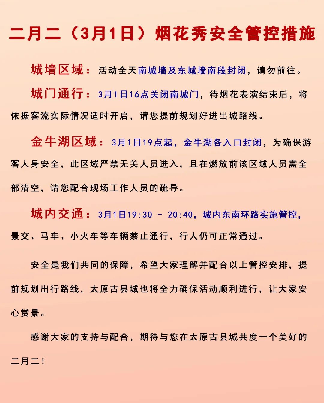 为配合上述活动有序开展,3月1日下午13时至21时: