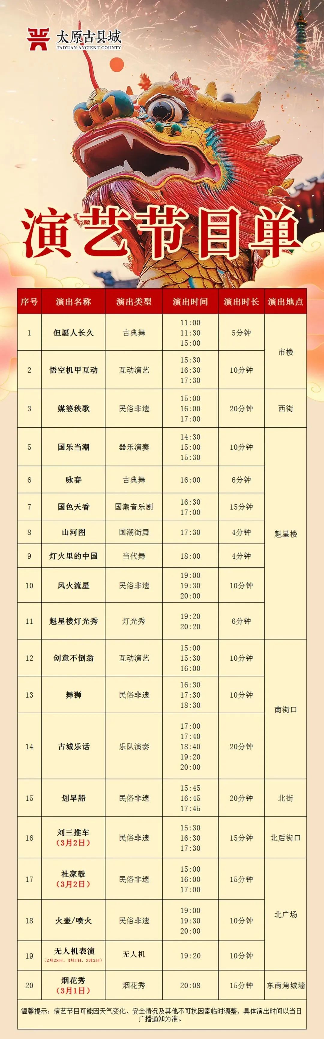 下午16时40分,“龙天庙会”民俗文化巡演将准时启幕。戏曲展演、晋阳锣鼓、古城铁棍等特色民俗文化活动将依次上演,轮番呈现。