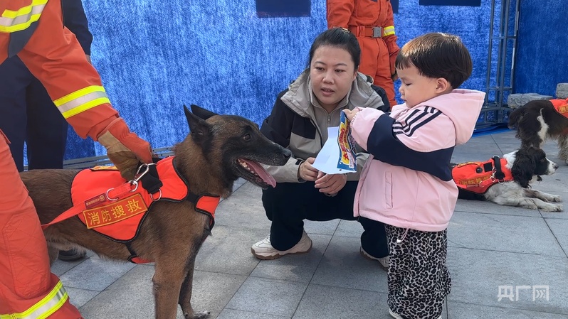 训导员正带领搜救犬与群众互动(央广网发 韩佳颖 摄)