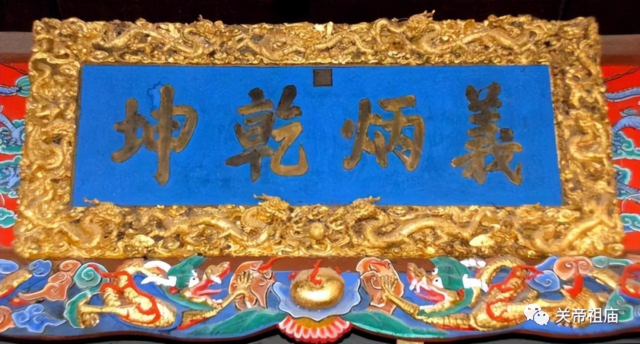 “义炳乾坤”匾,悬于崇宁殿内前二立柱之间,系清圣祖玄烨于康熙三十七年(1698)亲笔御书之作。“炳”,光明、彰显之意。“义炳乾坤”意为关公深明大义彰显于天地乾坤。
