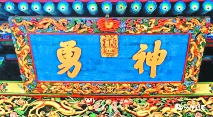 “神勇”匾,悬于崇宁殿前檐下,“神勇”二字,是乾隆三十三年(1768)清高宗弘历敕赐关帝谥号时亲笔书写,丰满圆润,极具皇家气象。“神勇”二字,形容关公非凡勇猛。