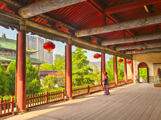 与三大殿相对的就是奏衍楼,始建于元代至正十年(1350年)之前,原为乐楼,以后各代均有增修,清康熙年间更名为“奏衍楼”。戏台面阔七间,横向一字排开,正对着三大殿。戏台最外侧有砖雕寿字影壁,台下为拱洞,均起到扩音的作用。