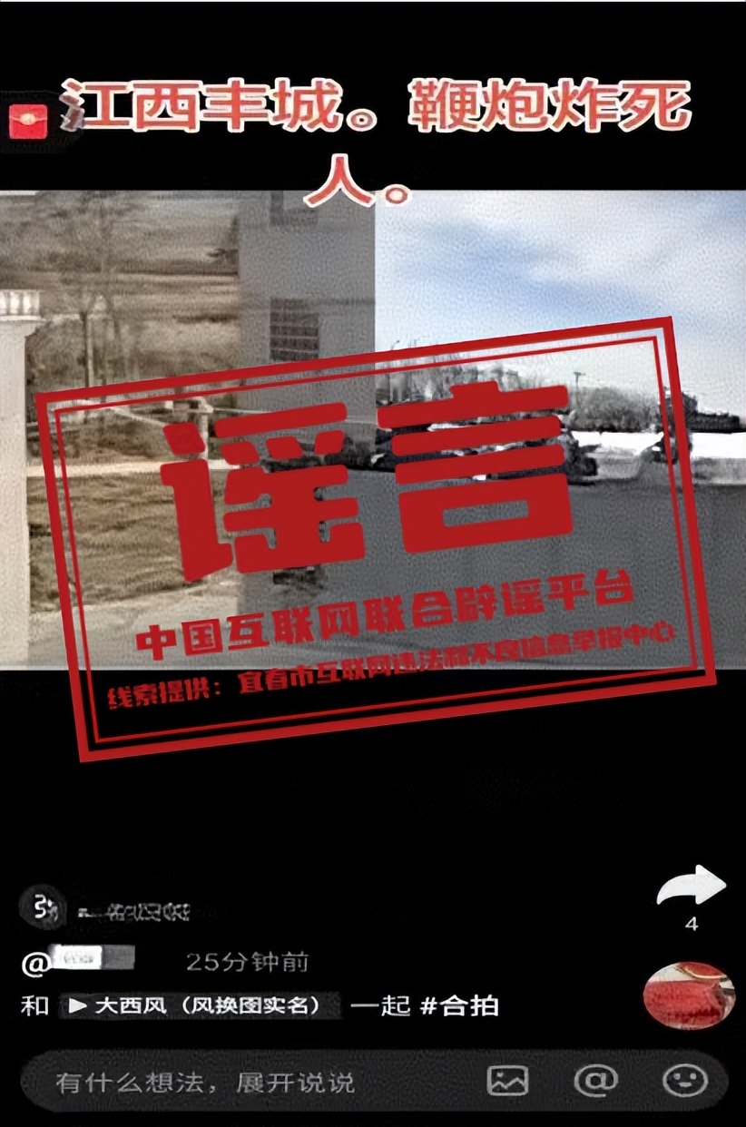 真相:2月22日,有网民发布视频称,“江西丰城鞭炮炸死人”。经核实,江西丰城没有发生鞭炮炸死人事件,该网帖系网民嫁接生成的虚假信息。(来源:“网信宜春”微信公众号)